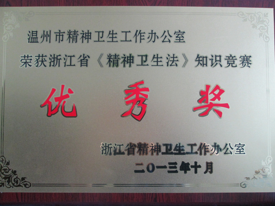 2013年10月,经浙江省精神卫生工作办公室评选,我市精卫办(丝袜a片 )荣获浙江省《精神卫生法》知识竞赛优秀奖。