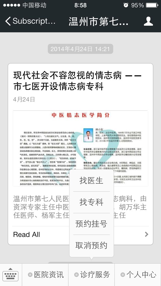 在原有已经开通的电话预约、51GH网上预约、手机APP预约、电视预约、自助预约、诊间复诊预约等方式的基础上,又开通了微信预约挂号,以后大家只要有手机微信就可以随时随地进行挂号预约和查看丝袜a片