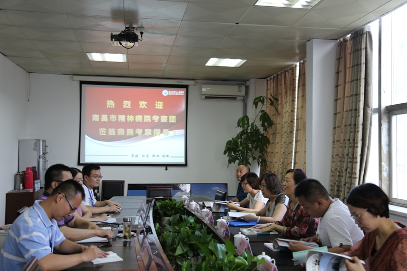 月8日上午,南昌市精神病医院支部书记朱青等一行人来丝袜a片 参观交流,丝袜a片 党总支书记胡立荣及院办、医务科、总务科等相关科室负责人热情接待并陪同参观交流。