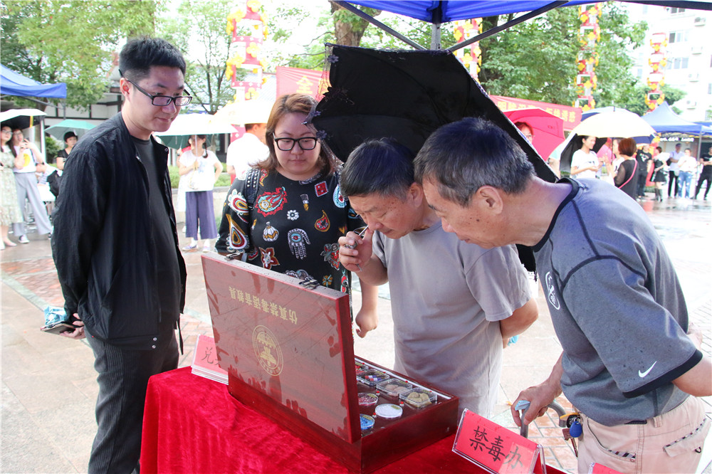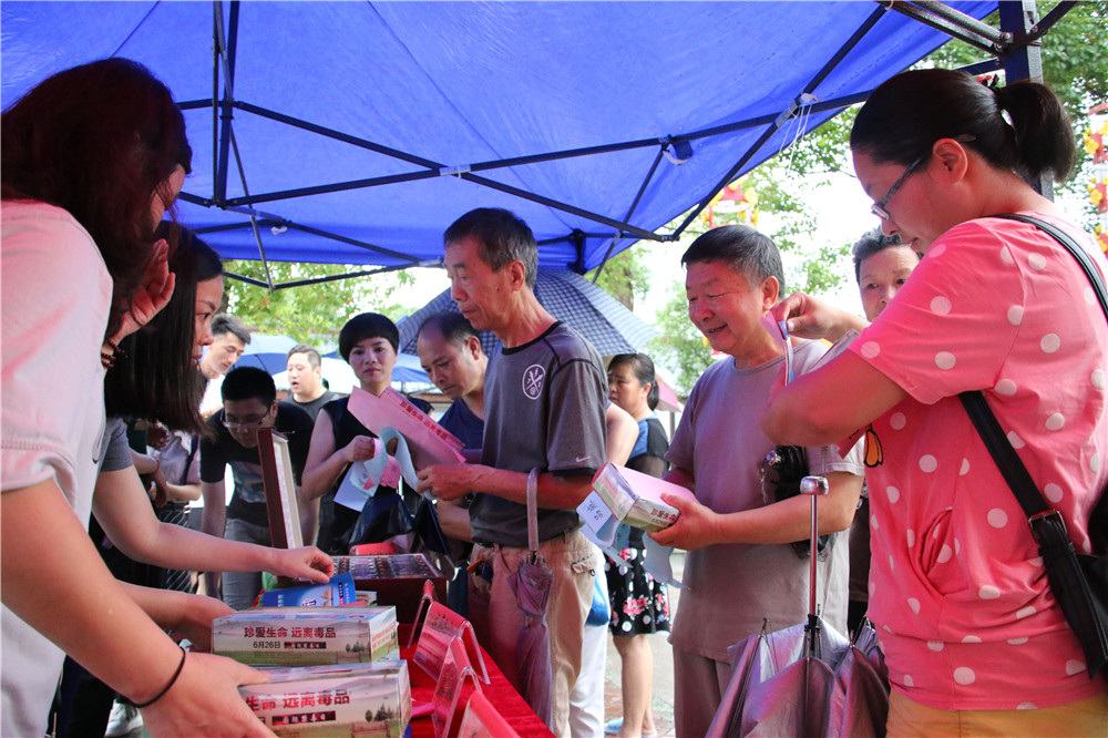 今天是6·26禁毒宣传日,温州市戒毒中心启动以“无毒青春,健康生活”为主题的6·26禁毒日系列宣传活动,并携手江滨街道在市区杨府山公园广场开展群众喜闻乐见的摆摊服务。自5月份以来,温州市戒毒中心坚持结合“突出重点、常抓不懈、注重实效”的工作实际,创新活动载体、营造浓郁氛围,将“三个一”系列宣传活动“送”到一线。一是启动一场大型广场宣传。市戒毒中心携手各县市区、属地街道等禁毒成员单位,在温州市大剧院,九山公园广场和杨府山公园广场各举办了一场禁毒宣传活动。期间,温州市戒毒中心药物依赖门诊部作为志愿者之一,启动禁毒图片展、发放禁毒宣传资料等相关内容,并分发《致市民的一封公开信》等广场宣传活动,还在现场举办仿真毒品样本为市民开展认知辨别。据统计,各场广场活动共分计发宣传资料近3000余份,禁毒宣传品900余份。