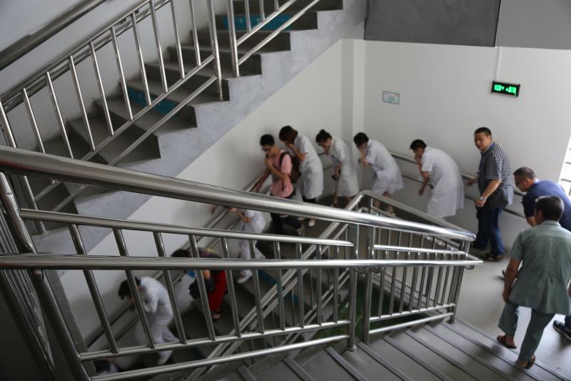培训结束后,启动实地消防演习。康复6楼消防警报响起,保卫科疏散组人员和护士长一起组织医护人员和职工按指定安全线路撤离,安全员站在楼梯口维持秩序。全体人员在短短两分钟内就撤出住院楼,到达东门院外空旷场地,整个疏散过程紧张、有序,所有医护人员和职工都按计划方案行动。