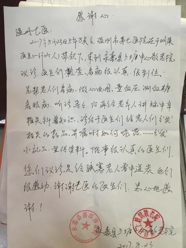 义诊临近结束,敬老院院长拿出了一封《感谢信》,上面详细记录了“七医人”为敬老院的老人所做的每一件事,表达了对医护人员深深的感激之情。这份满满的“爱心”亦是一份沉甸甸的责任,更是对医护人员平凡工作的最大鼓励,也将成为七医人“蒲公英之旅”前行的动力。
