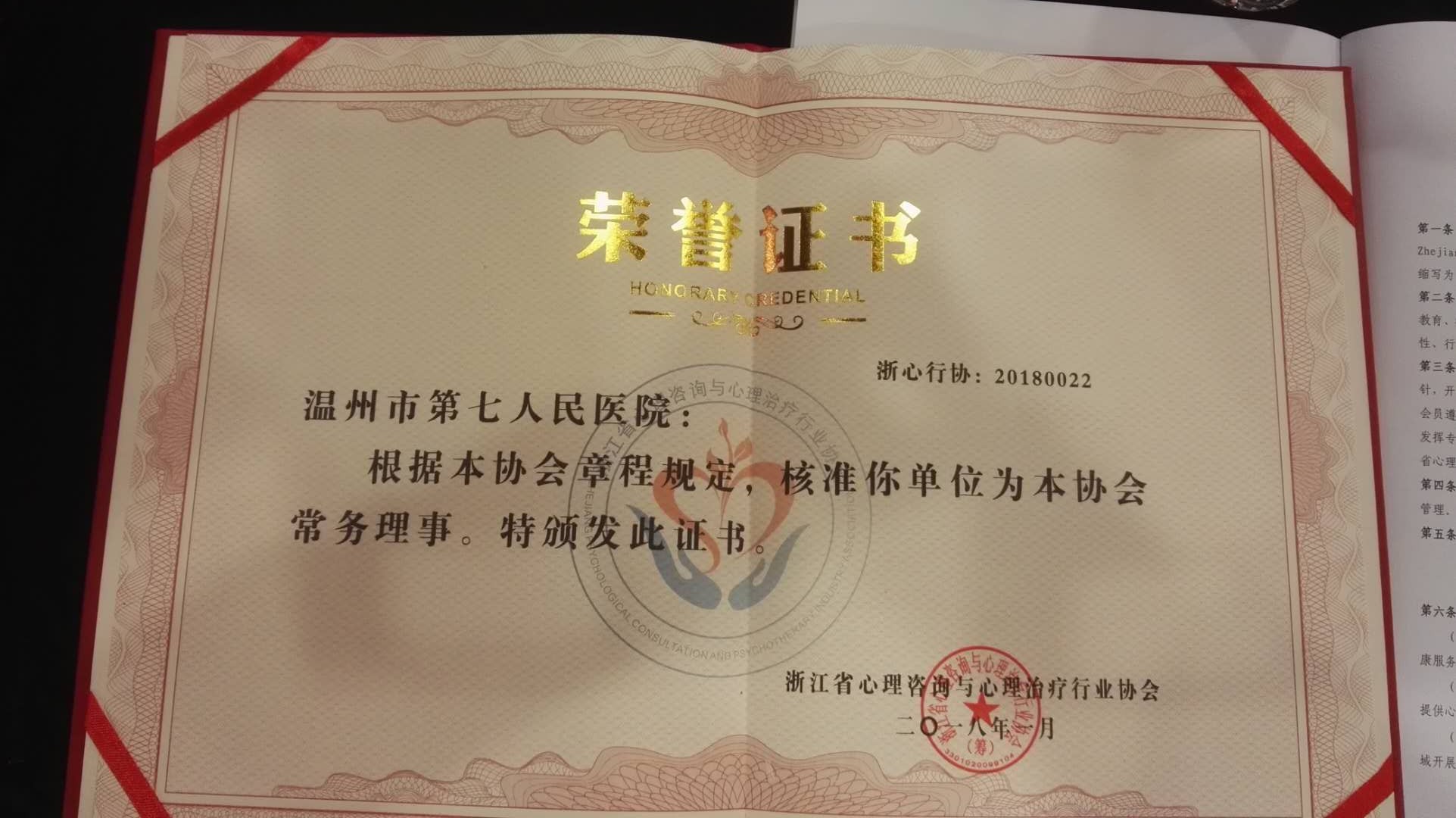 浙江心理咨询与心理治疗行业协会是由省民政厅批准成立的行业协会,省内从事心理咨询和心理治疗的医疗卫生单位和机构、高等院校、司法、教育、社会机构、民政系统及其他心理健康服务机构等100多家单位机构“抱团”参加,旨在进一步规范全省心理健康服务行业,充分发挥行业组织作用。本次会议,市七医还受邀加入了浙大一院精神医学联盟,医务科长陈策参加授牌仪式。