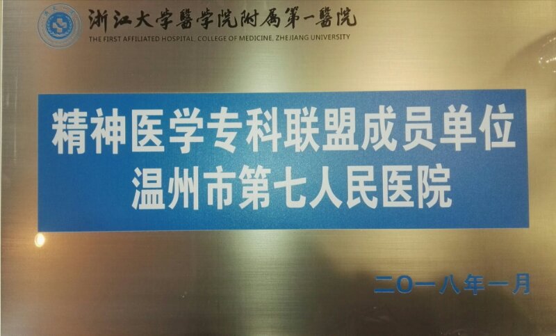 作为温州市唯一一家公立精神专科医院,市七医已先后加入上海市精神卫生中心精神专科联盟、浙大精神卫生中心精神专科联盟、浙江省精神卫生专科联盟、浙江省中西医结合医联体和浙江大学精神卫生中心睡眠医学专科联盟,并于2017年10月份牵手全市6家精神专科医院成立“温州市精神医学专科联盟”,开启“纵横”贯通、抱团发展模式。成立以来,市七医组织联盟内临床医疗护理专家团队定期到联盟医院查房、教学、讲座,通过定期的医护间交流合作,提升了临床诊疗护理水平和医疗质量。