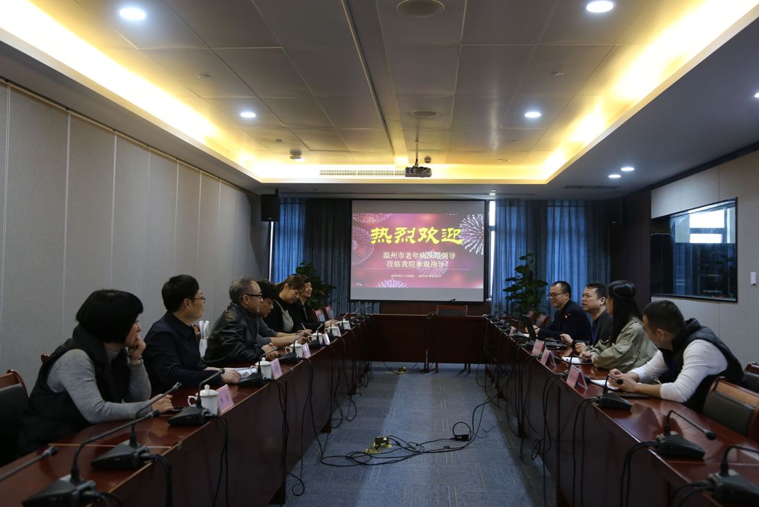 12月6日,温州老年病医院院长施仲义,副院长苏朝辉、潘东波一行6人莅临丝袜a片 指导交流。期间,交流组一行对丝袜a片 新院区开诊表示祝贺的同时,深入了解丝袜a片 运营状况并参观病区,还围绕“老年人康复、老年人照护”相关内容开展座谈交流。院长林小东、院长助理陈春棉等相关职能科室负责人陪同座谈。