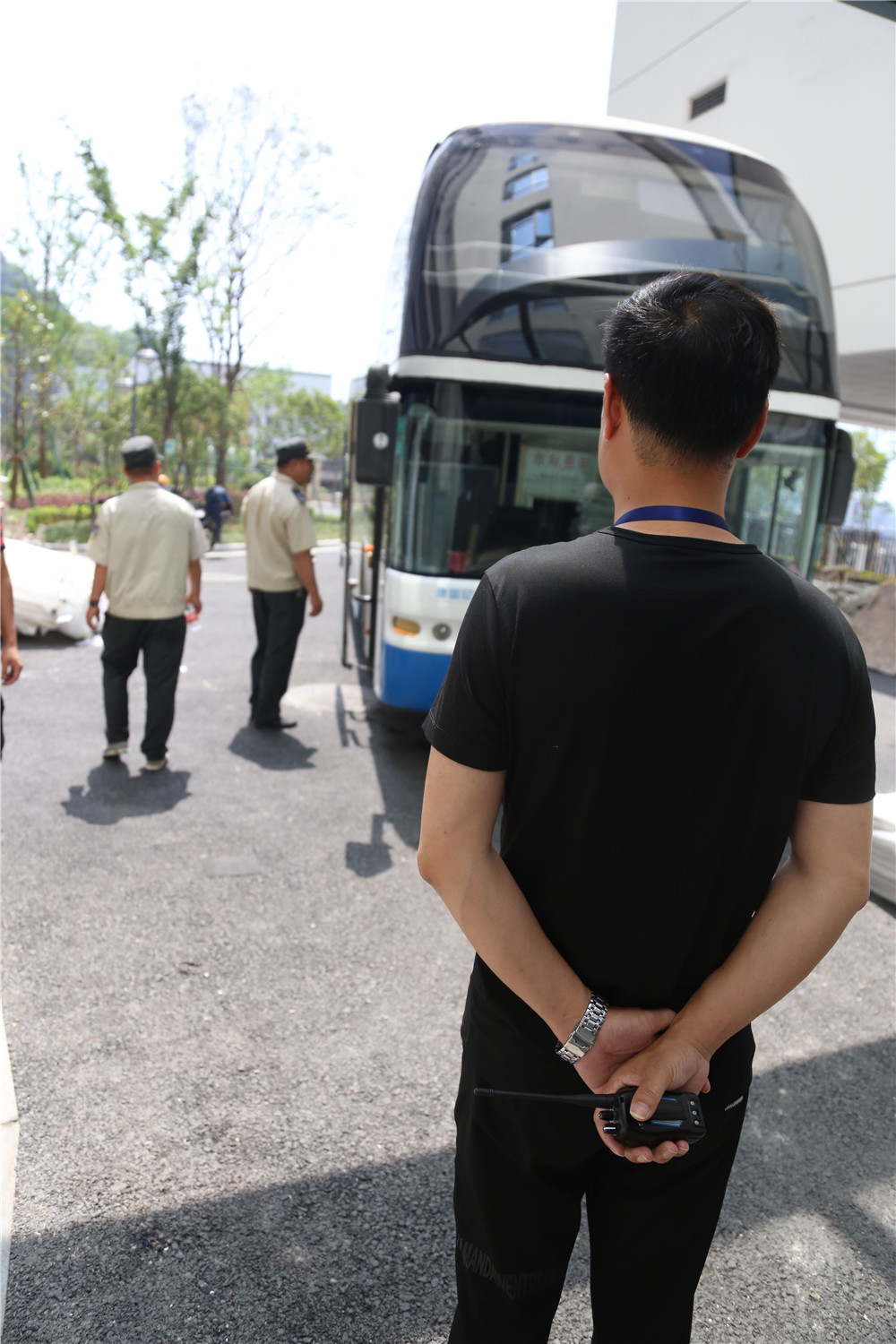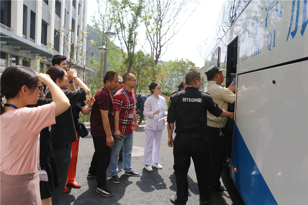 大巴门打开的那一刻,保卫科长、保卫人员早已就绪就位。你瞧,保卫科长早早地等候在住院大楼前,指挥安排着安保人员为病人保驾服务。