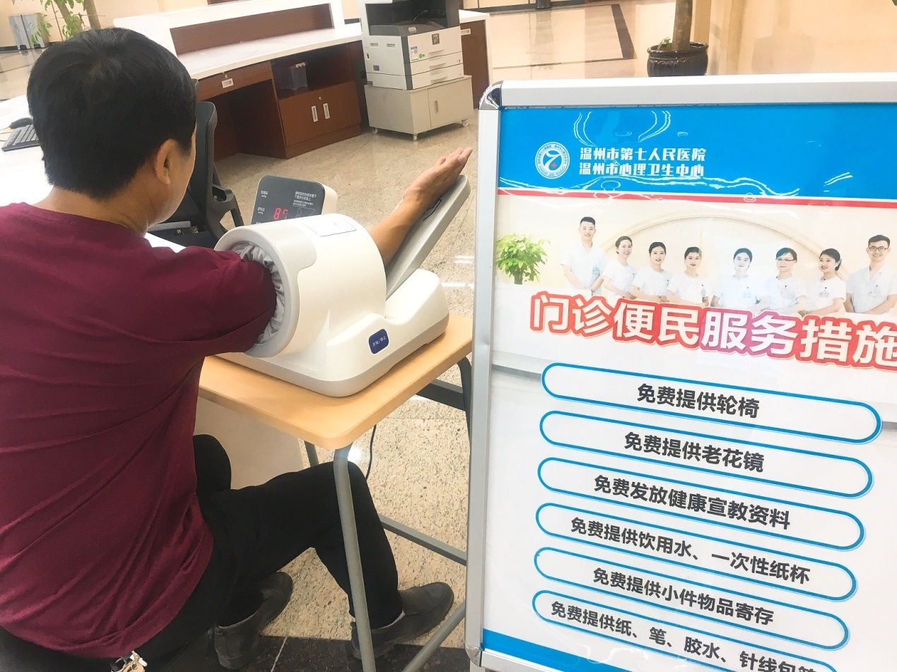 大厅有方便病人等待班车的长椅,服务中心还提供各种便民服务措施,例如提供轮椅、一次性水杯、测量血压、提供证件复印、手机充电等,体现了我们“用心呵护,用心关怀”的服务理念。