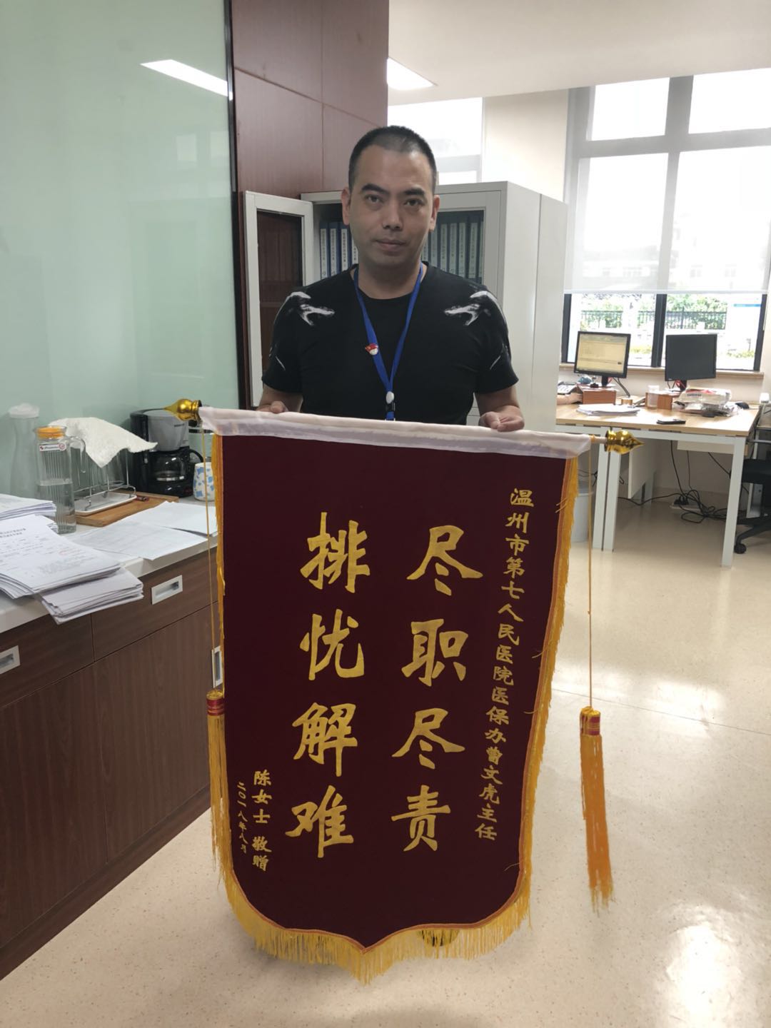 “谢谢医院领导,谢谢医保办,谢谢你们这些好政策。”伴着这简短的感激之言,8月24日上午,患者家属陈女士将写着“尽职尽责 排忧解难”的一面锦旗递到了丝袜a片