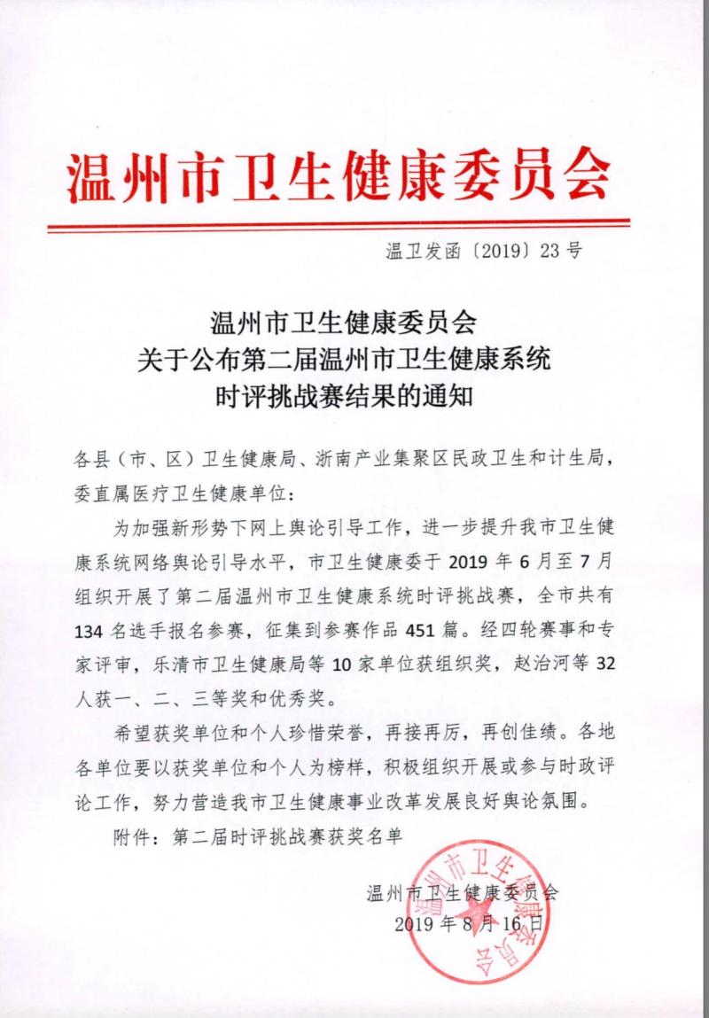 从市卫健委第二届届时评挑战赛结果通报传来喜报,市七医时评挑战赛7人参赛队在本次比赛中获得了“团体组织奖”称号,同时参赛组员1位获得个人二等奖,3位获得个人优秀奖的优异成绩。