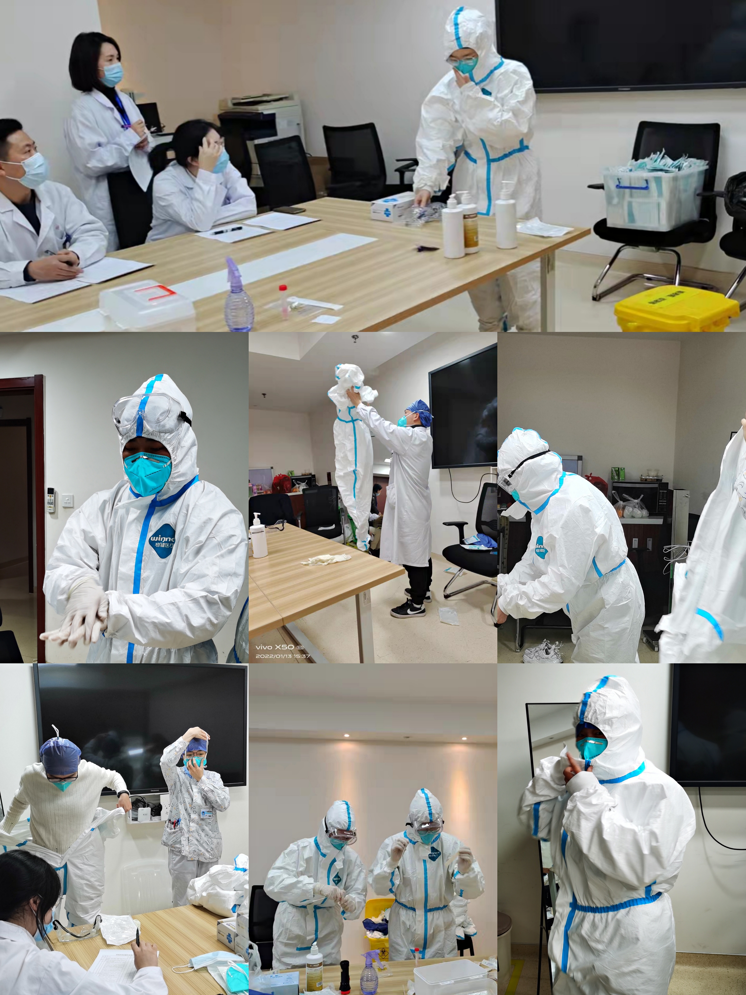 虽然参加考核的人数多,时间紧,但是考核有条不紊进行。考核物品已经由医务科提前备好了。穿防护服、脱防护服、采集核酸同时多名医务人员在进行操作,虽然环境有点嘈杂,但是被考和考官做到彼此眼里只有对方,考官的眼睛牢牢地盯住操作者,其他环境声音都被自动屏蔽掉。考官们言语温和,但是态度绝不含糊,技术要点一个个抠,边抠边讲解。“戴眼罩或防护面屏不能直接压皮肤,要压在防护服外面。”“防护服的帽子要盖住里面一次性帽子,所以这些步骤需要照镜子进行,还有女士的头发太长太多扎好的丸子太大也会导致防护服的帽子拉不过来,所以万一要临时拉出去应急做采集核酸,头发还是要处理一下。”“活动一下防护服是否适合应该在最后的步骤,而不是在戴手套之前,因为手套要压住袖口,会影响防护服的合适度,所以最后试可以及时调整。”“采集的时候,棉签不要碰到其他部位,折的时候手不要离管口太近,喷洒消毒水千万不要喷到条码”......