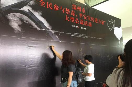温州网5月12日讯(通讯员 姗姗)5月10日下午,在市歌剧院门口,许多过往市民、志愿者,纷纷在“全民参与禁毒,平安宣传进万家”的签名墙上留下自己的姓名,倡议加入禁毒宣传行列。据悉,这是温州市戒毒中心在“6.26国际禁毒日”前夕启动的系列禁毒宣传活动之一。