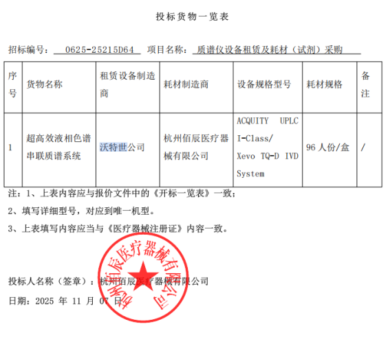 1 | 质谱仪设备租赁及耗材(试剂)采购 | 见附件 | 1 | 项 | 47.60% | 杭州佰辰医疗器械有限公司 | 杭州市临平区东湖街道新颜路22号7幢401S |